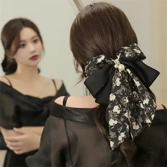 test--Women Korean Pearl Streamer Bows Hair Clip Ponytail Hairpin Duckbill Clip Pearl Chiffon Bowknot Hair Grips Barrettes Headdress