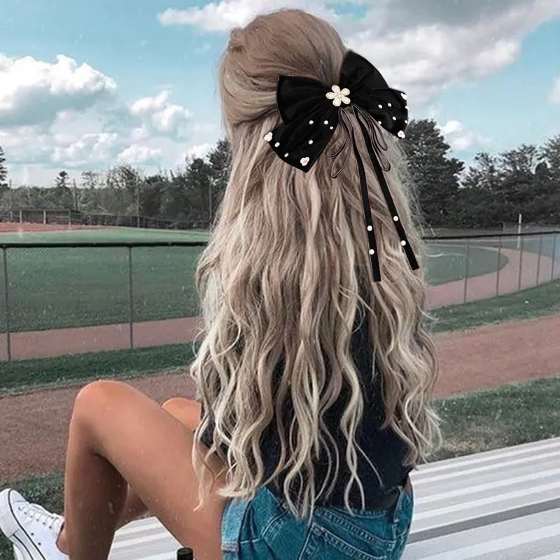 Long Ribbon Hair Bow Clips Big Bows Velvet rhinestones Barrette Vintage Women Hair Accessories French Hairpins Girls Hair Grips